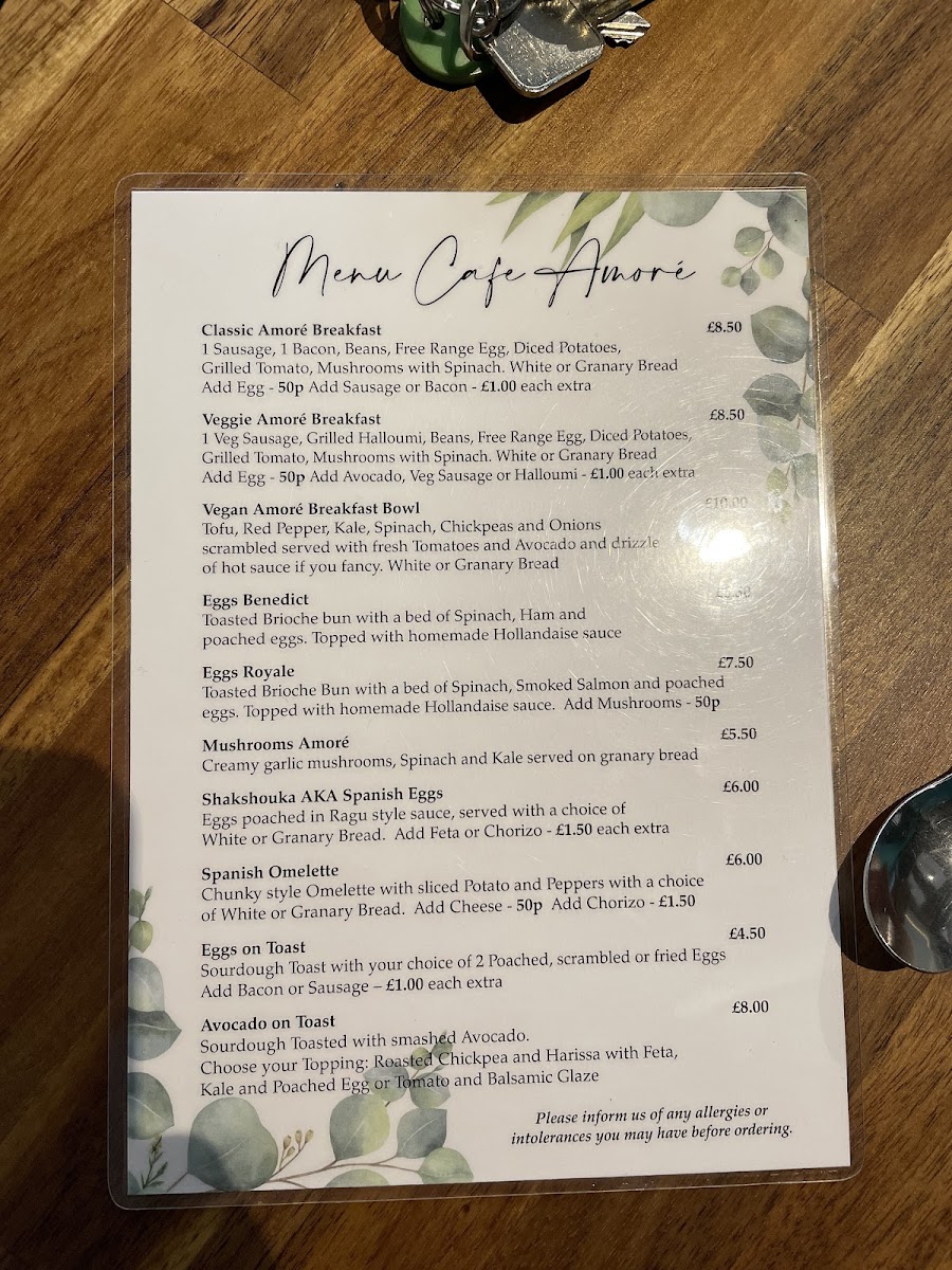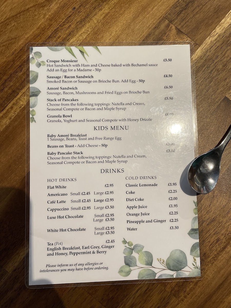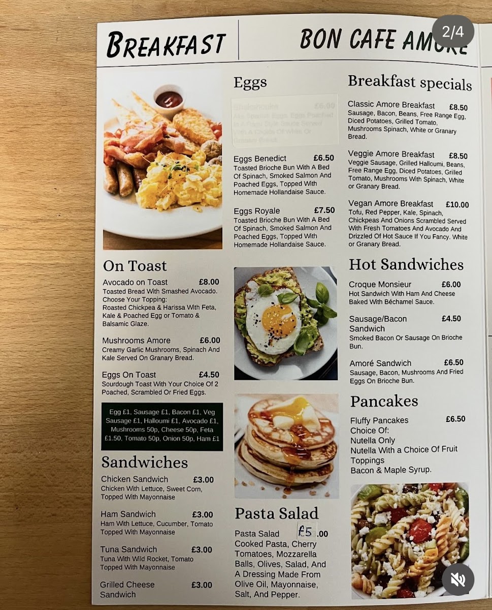 The menu at Bon Café Amore offers a variety of options suitable for breakfast, coffee breaks, and light meals. Visitors can choose from a selection of hot drinks, including espresso, Americano, flat white, cappuccino, mocha, latte, and hot chocolate, each priced between £2.95 and £3.45.